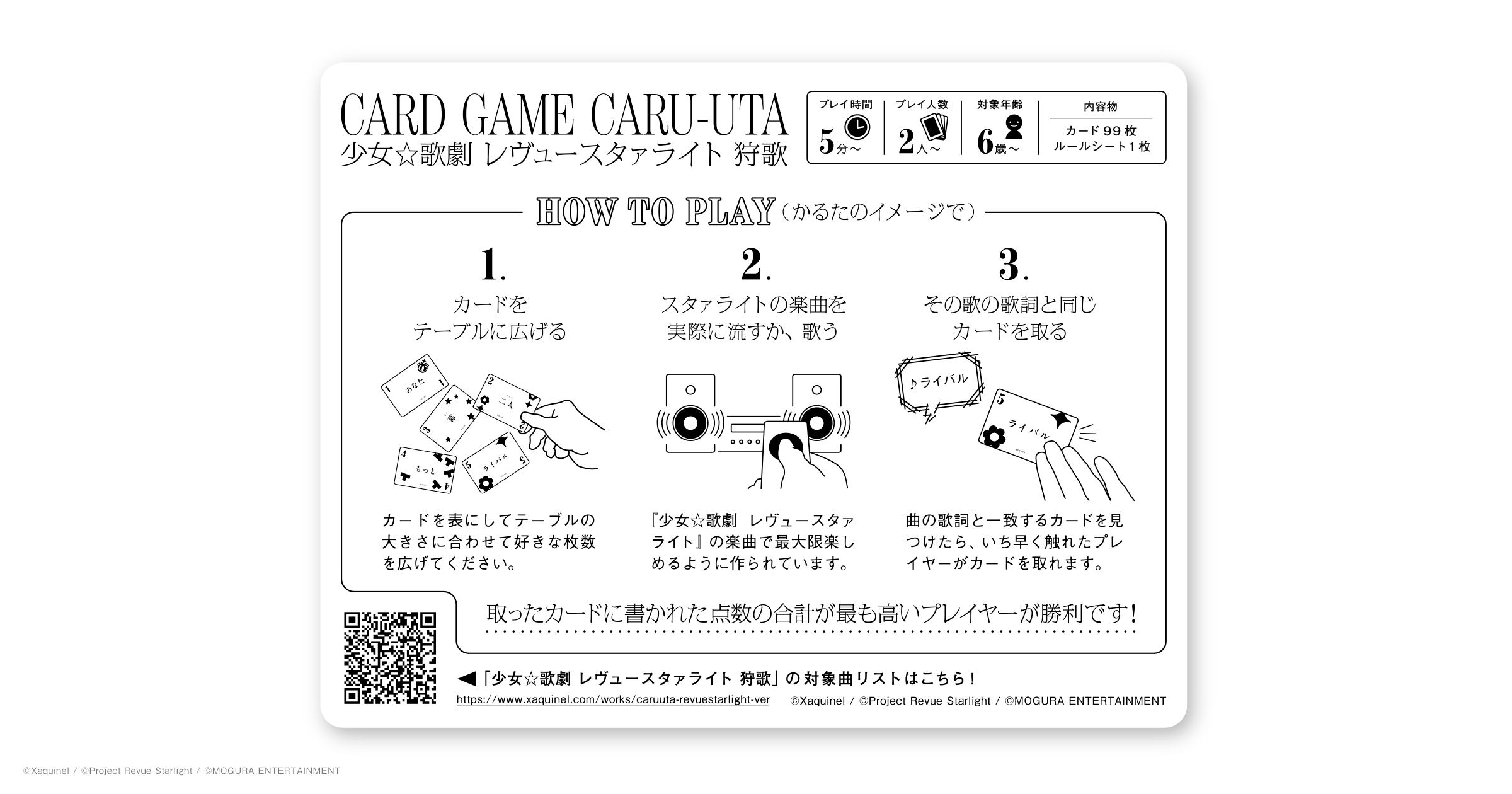 “「少女☆歌劇 レヴュースタァライト」の楽曲で最大限楽しめるように”作られており、対象曲は全28曲。 パッケージは舞台少女9人のキャラクターカラーと劇中のモチーフを組み合わせ、作品の世界観を表現したデザインに。99枚のカードには、アニメと映画の場面写真を計99種類使用。また通常はカードに書かれた1〜5点の点数の合計で競い合う「狩歌」ですが、今回は特別に9点のカードを2枚用意しています。